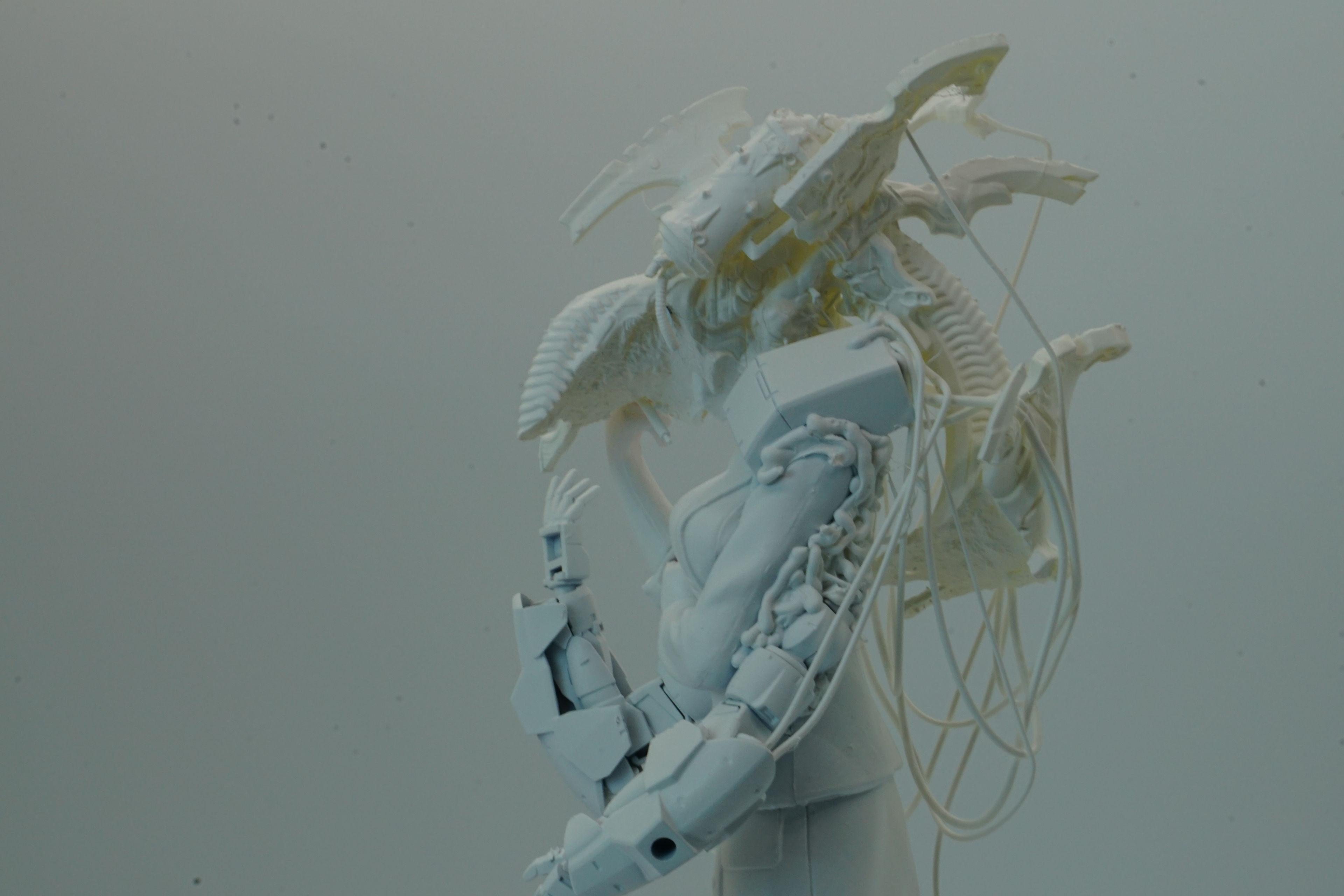 Maa-Vo-Ra's arms are a testament to her journey and skill, each one meticulously designed to aid in her surgical precision. Her headgear, resembling a creature of the forest, not only protects her but also allows her to interface directly with the bioluminescent data streams that flow through the White Forest. This connection enables her to diagnose and treat her patients with an almost supernatural accuracy.